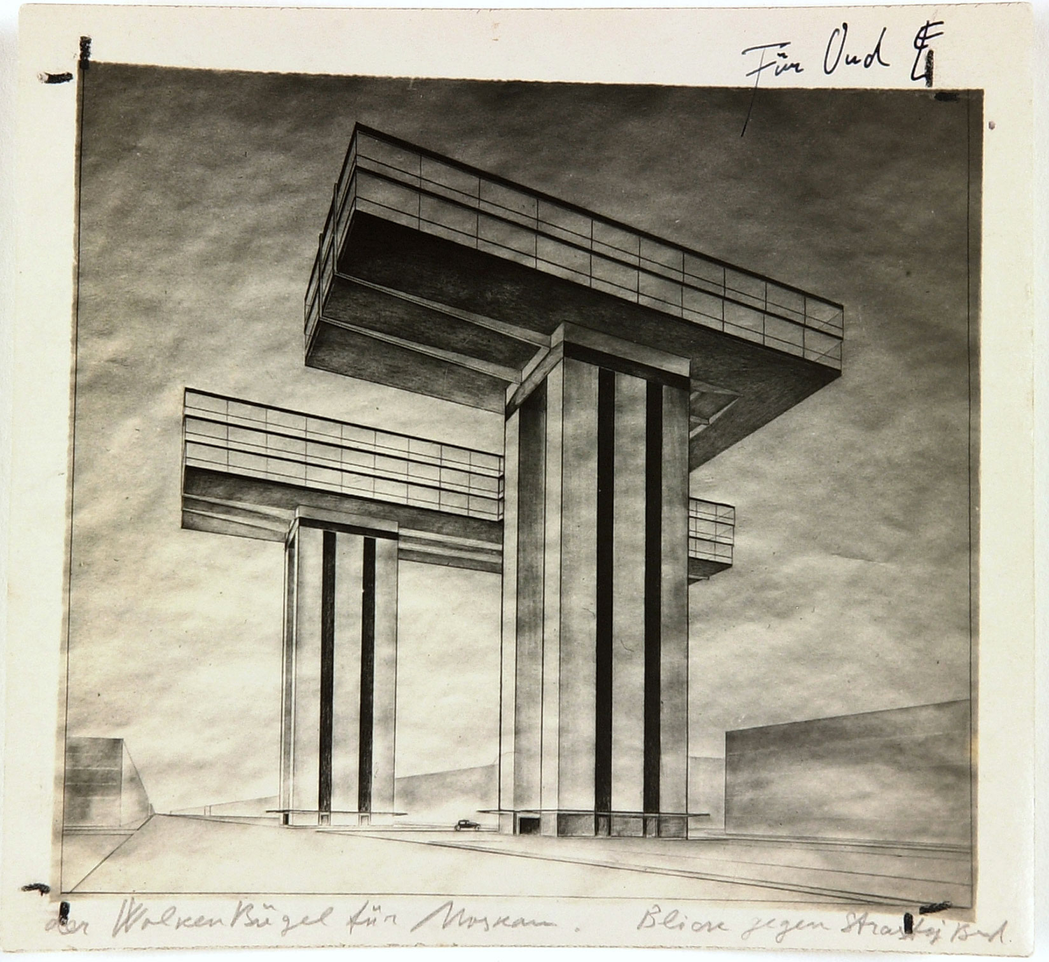 Архитектурное преодоление Лисицким пропагандировалось в тех же проунах — «Домах над землей», представлявших собой некие космические станции, которые можно было размещать в любом положении в проунраумах и печатать Хан-Магомедову вверх тормашками («вращая проун, мы ввинчиваем себя в пространство»). Знаменитый «горизонтальный небоскреб» (1924—1925) Лисицкого стоял на трех ногах, из которых можно было сразу попасть под землю — в метрополитен или сесть в трамвай. Такие небоскребы должны были «парить» над землей на местах транспортных развязок, сохраняя место для зелени и транспортных артерий.